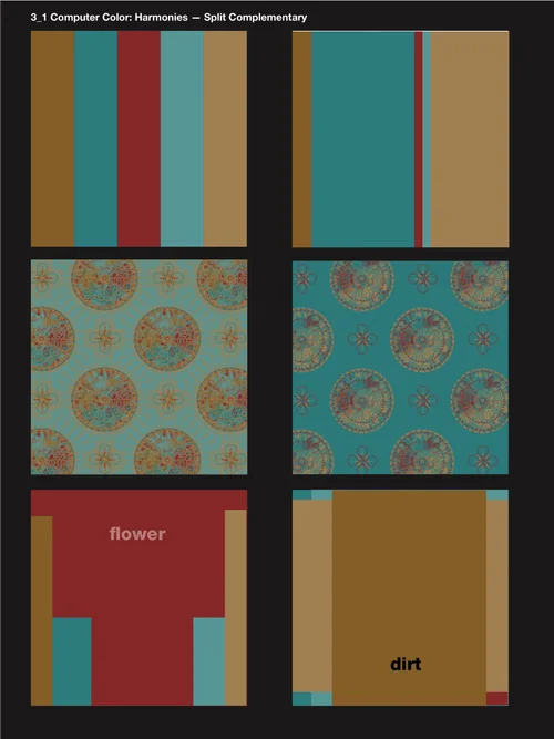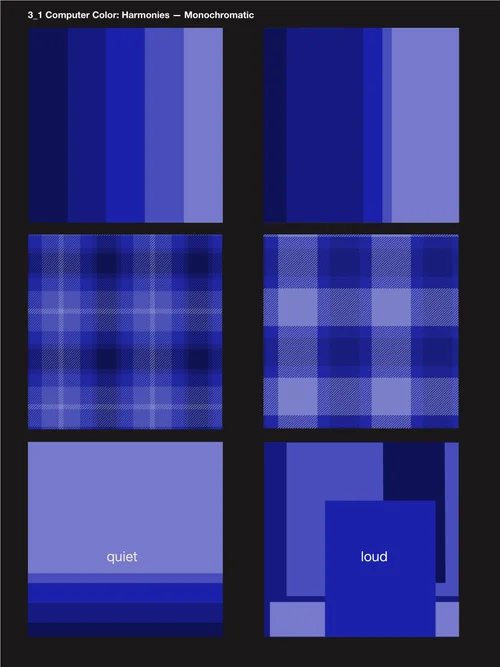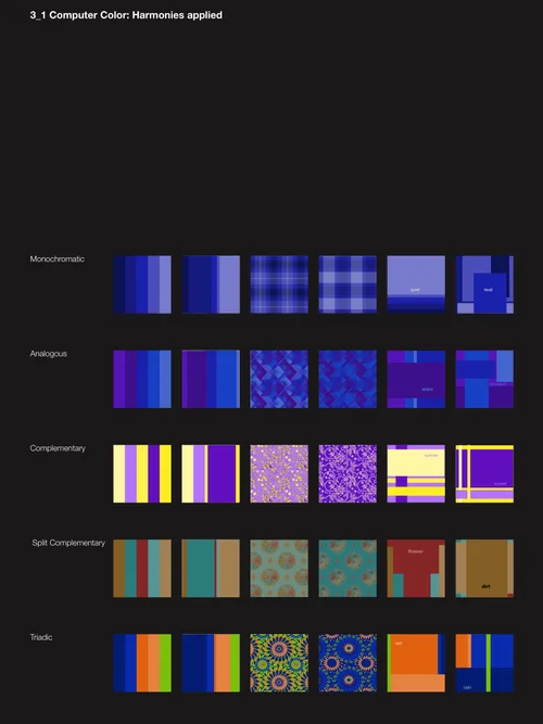 * achromatic scale • complementary colors • harmonies • contrast & simultaneous contrast • color wheel • color pairing • Same Hue • same saturation • different value • progressions • proportions • monochromatic • analogous • split complementary • triadic • etc.